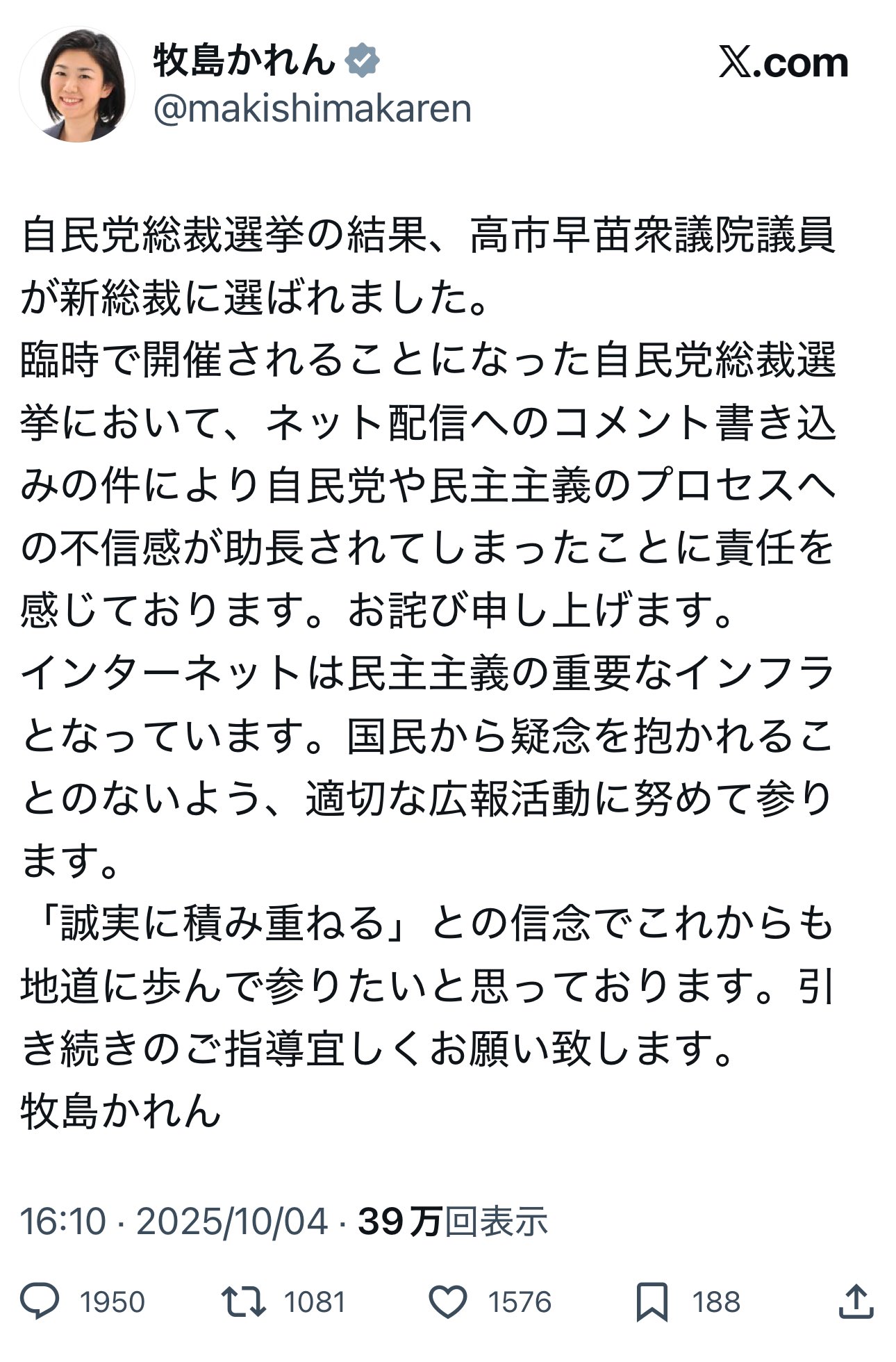 牧島氏は総裁選の結果判明後、「ネット配信へのコメント書き込みの件により自民党や民主主義のプロセスへの不信感が助長されてしまったことに責任を感じている。お詫び申し上げる」と投稿した。