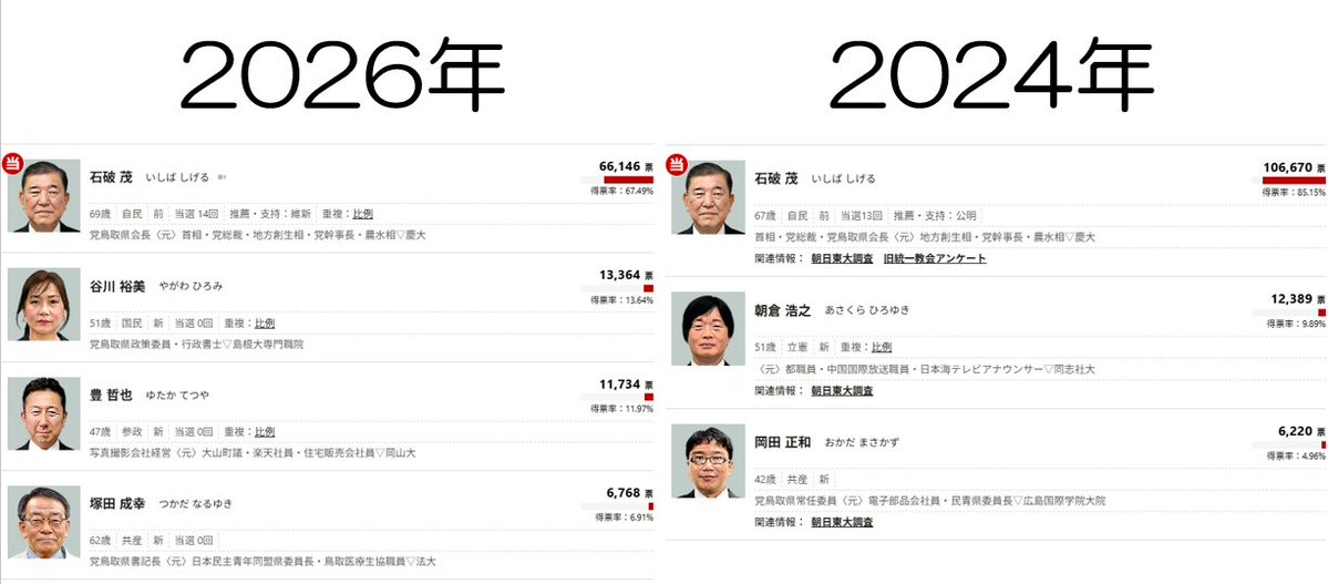 これ、前回は首相就任直後で極端に投票数が増えていたんじゃないかと思って鳥取1区の得票数を見ると、毎回コンスタントに10万票強を取っているんですよね。つまり地元でも支持が激減しているわけで、いかに石破政権が酷かったかということを如実に示していますね。 https://t.co/jVlkyVsTBM
